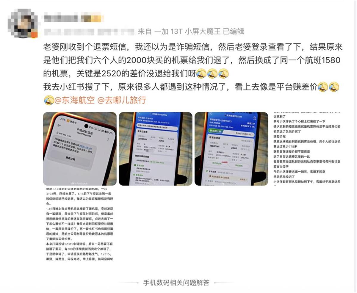 极目新闻记者从上述博主发布的短信及订单截图中看到,其尾号8771的客票于4月28日晚上11时45分被退票,新的客票尾号为0723,前后两张客票系同一航班,但新票比原票每张少了420元。其乘坐的航班属于东海航空,订票平台为“去哪儿旅行”。该博主表示,其搜索发现,也有网友反馈遇到类似疑被平台“退高买低赚差价”的情况。