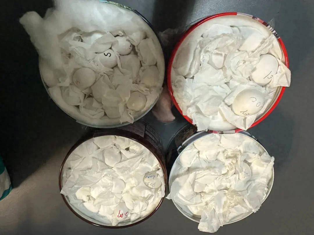 海关关员随即拦截并进一步查验,在行李袋中找到4个包装完好的饼干罐,罐身存在明显重新封装的痕迹,打开后发现饼干罐内均装有用棉花和纸巾包裹的、大小不一的鸟蛋,共计136枚,其中2枚鸟蛋已孵化出雏鸟,部分鸟蛋在强光照射下已可以观察到幼鸟活动迹象。