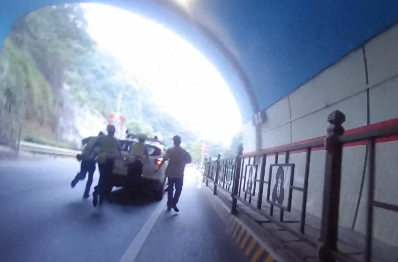 随后,董方勇在故障车辆后方设置警示标志,指挥过往车辆避让;曲比尔夫则和游客一起推车。推行数米后,交警俄觉小东、王曦濛赶到现场,加入推车队伍。三名交警用尽全力推车,越推越快,近似“飞奔”,很快将故障车辆推至隧道外的安全区域。