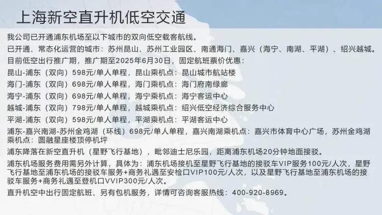 除了迪士尼、黄浦江等游览路线,目前新空直升机推出的低空交通航线同样需求不小,以浦东星野基地为例,目前已经开通基地和嘉兴平湖、绍兴、嘉兴市、海门、海宁、苏州、昆山等地的空中的士,便于城际往来,大大节省了出行时间。