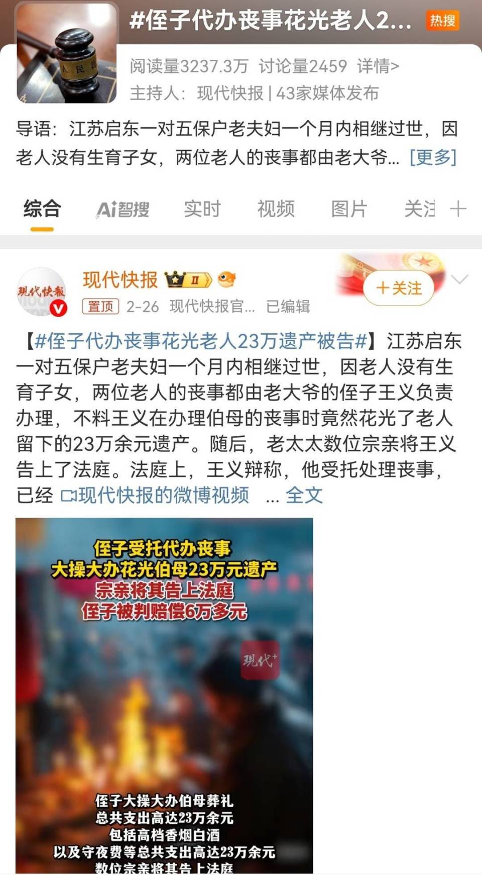年逾八旬的五保夫妻先后去世,侄子代办丧事花光23万遗产,被其他亲戚起诉索赔。今年2月,江苏南通一起家族官司登上热搜。