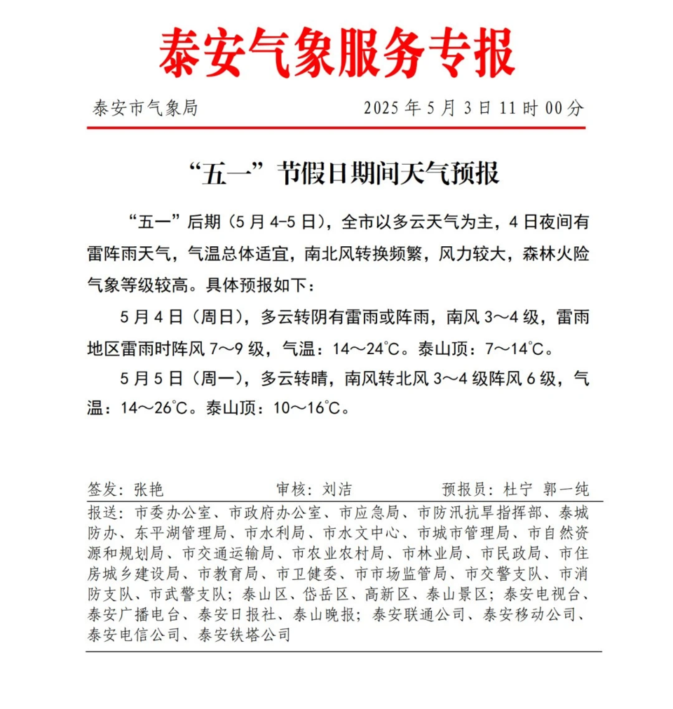5月3日,泰安市气象台发布最新预报:今天白天到夜间,晴间多云,北风转南风3到4级,湖面4到5级,最低气温9℃左右,最高气温22℃左右。