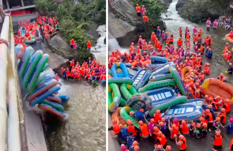 据媒体报道,网友拍摄的视频显示,景区漂流始发点有很多人,身穿橙色救生衣的游客聚集在水中,十多艘充气漂流船被工作人员从高处的装卸车上一次性推下,接连坠入水中。船体堆叠在浅水区,游客之间拥挤推搡,蜂拥抢船,“局面混乱不堪”。
