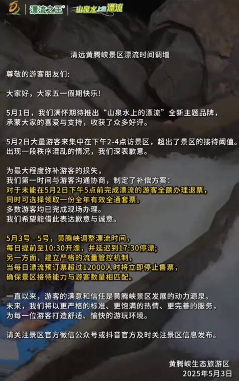 此外,景区对于未能在当天下午5点前完成漂流的游客制定了补偿方案,全额办理退票,同时可选择领取一份全年有效全通套票。另一方面,景区表示将建立严格的流量管控机制,当每日的漂流预订票超过12000人时将立即停止售票。