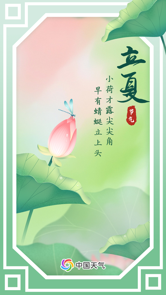 “小荷才露尖尖角,早有蜻蜓立上头。”立夏时节,荷叶初生、蜻蜓早立,一派生机盎然的景象。此时,天气越来越热,雨水也日益充沛,北方气温上升,易出现干热风,南方雷雨增多,强对流天气频发。