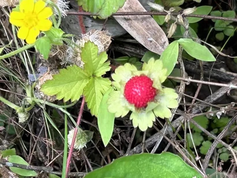 蛇莓是蔷薇科蛇莓属植物,经常出现在马路边。果实如同一个浑圆的红色肉球,表面有一个个红色的小突起,里面则是白色的。果味寡淡带有稍许涩味,没有香味。小时候大人就告诉我们蛇莓不能吃,说是有蛇吐过口水有毒。