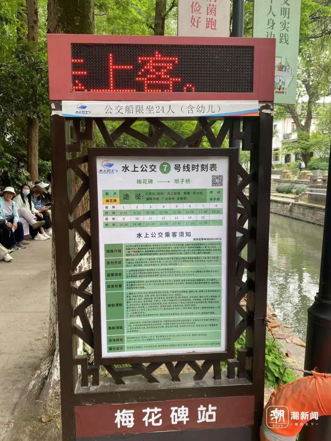 提示牌上回答了大多数游客的问题“水上公交票价3元,先到先排,不允许插队和代排,离开队伍限时10分钟。上船再买票,一船24人(包括儿童)……”