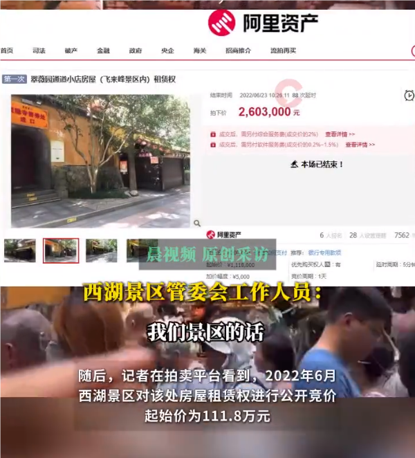 随后,记者在拍卖平台看到,2022年6月,西湖景区对该处房屋租赁权进行公开竞价,起始价为111.8万元,经过88次延时,成交价为260.3万元。竞价公告显示,该处房屋面积为8.5平米,税收要求为一年60万元。