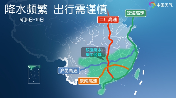 未来六天(5月5日至10日),江南、华南和贵州等地降雨连连,局地雨势猛烈,且强对流天气频发。强降雨和强对流天气可能对沪昆、二广、沈海、泉南等高速部分路段造成不利影响,公众需注意出行安全。