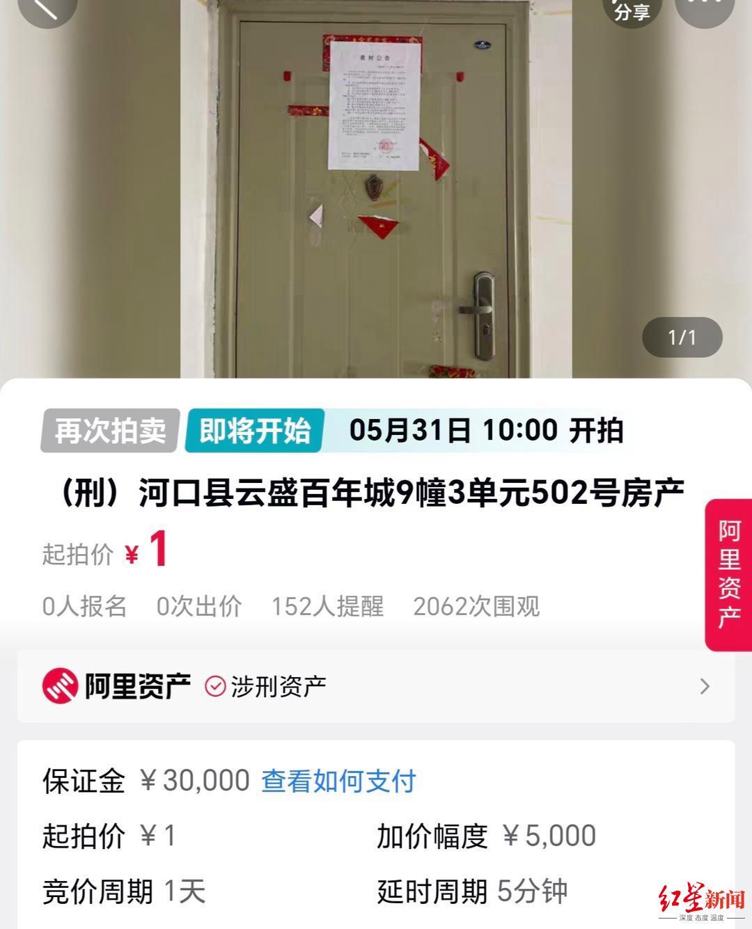5月5日,红星新闻记者从淘宝网司法拍卖网络平台注意到,位于云南河口县一套建筑面积150.56㎡的住宅将被司法拍卖,起拍价仅为1元,目前尚无人报名。