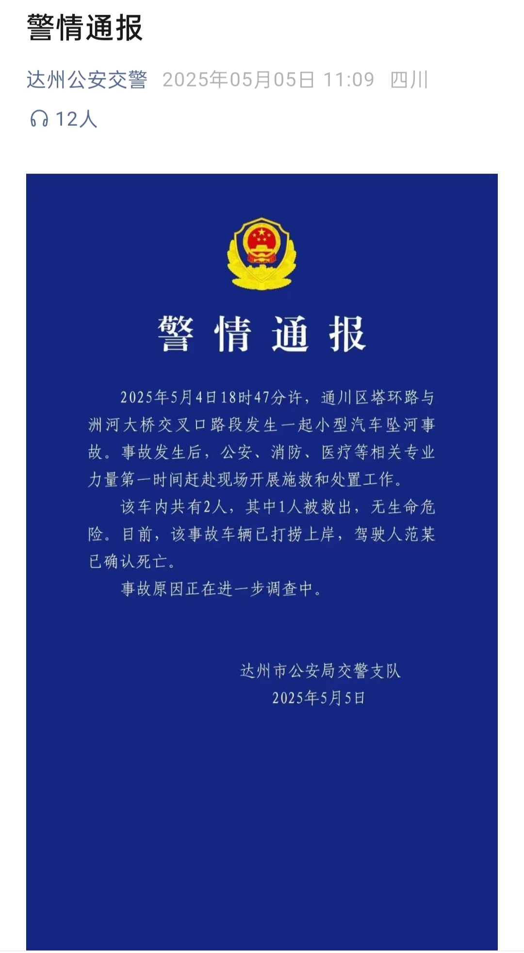 5月5日上午11时许,达州市公安局交警支队发布警情通报:2025年5月4日18时47分许,通川区塔环路与洲河大桥交叉口路段发生一起小型汽车坠河事故。事故发生后,公安、消防、医疗等相关专业力量第一时间赶赴现场开展施救和处置工作。该车内共有2人,其中1人被救出,无生命危险。目前,该事故车辆已打捞上岸,驾驶人范某已确认死亡。
