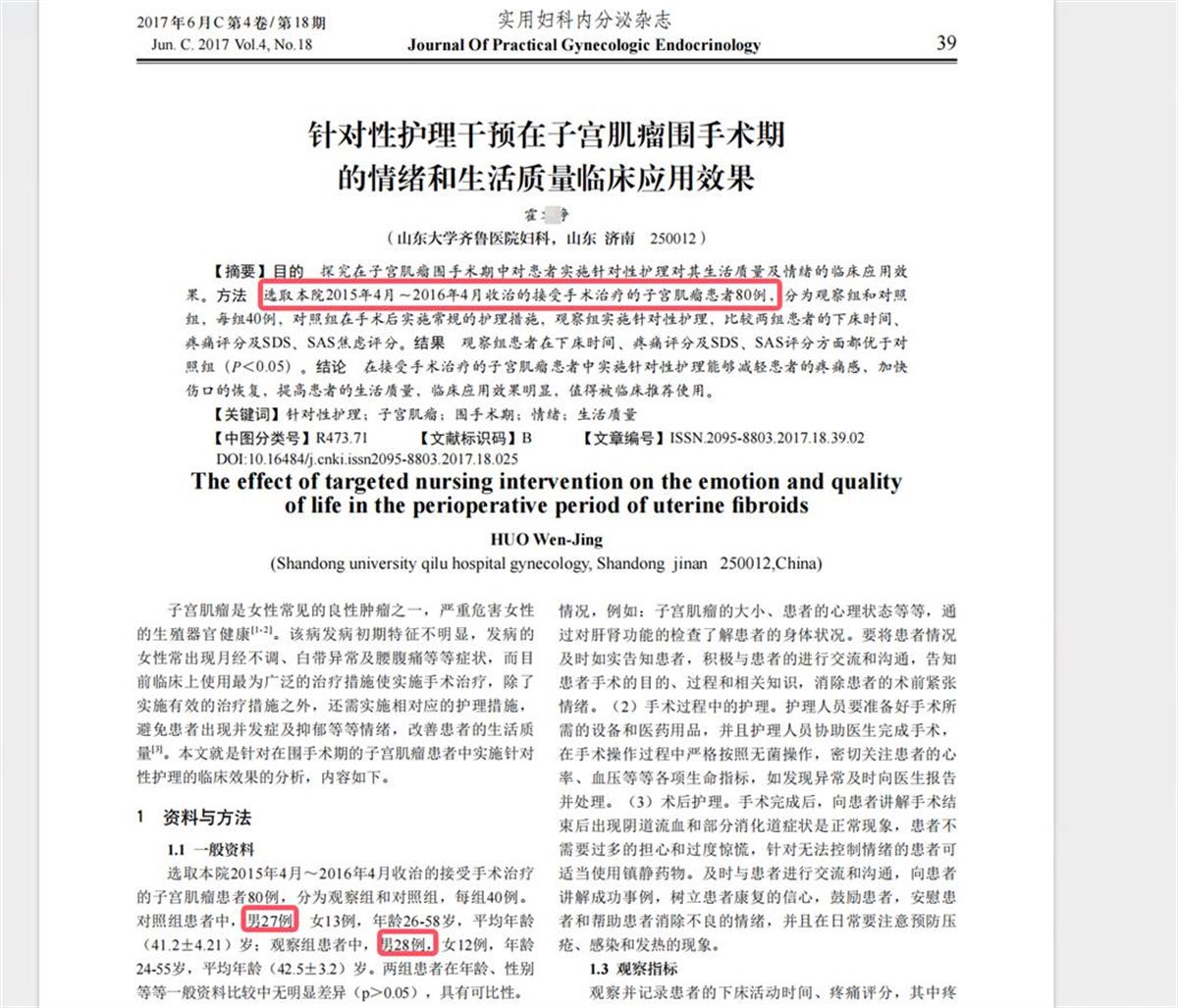 引发争议的论文题为《针对性护理干预在子宫肌瘤围手术期的情绪和生活质量临床应用效果》,作者系山东大学齐鲁医院妇科护士,文章发表在《实用妇科内分泌杂志(电子版)》。