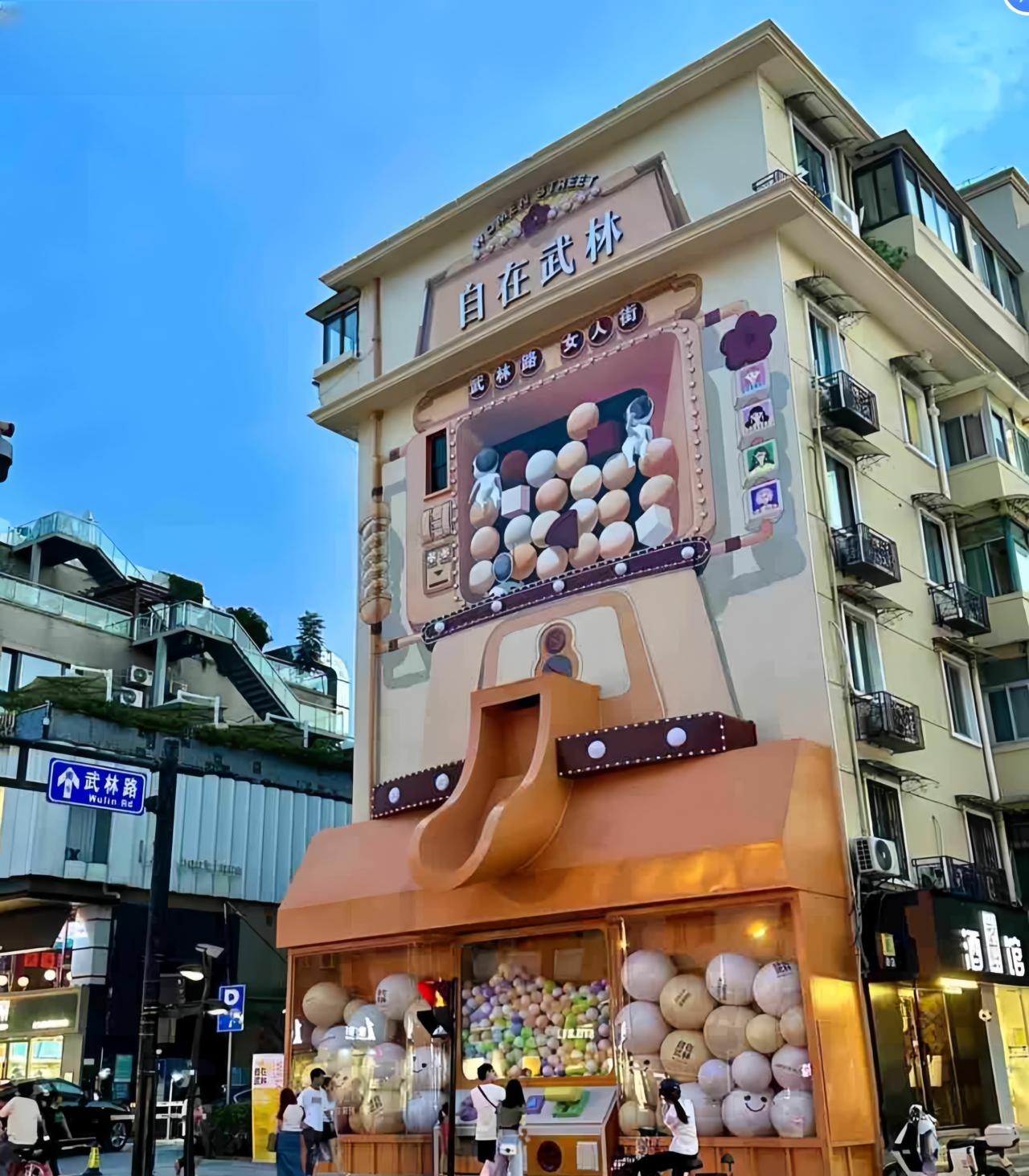 杭州亚运会期间,武林路超大扭蛋机曾吸引过很多人驻足打卡。橙色的巨大扭蛋机,顶部是一个超大滑梯,下方的玻璃橱窗里装满五颜六色的大球,拍照妥妥出片。