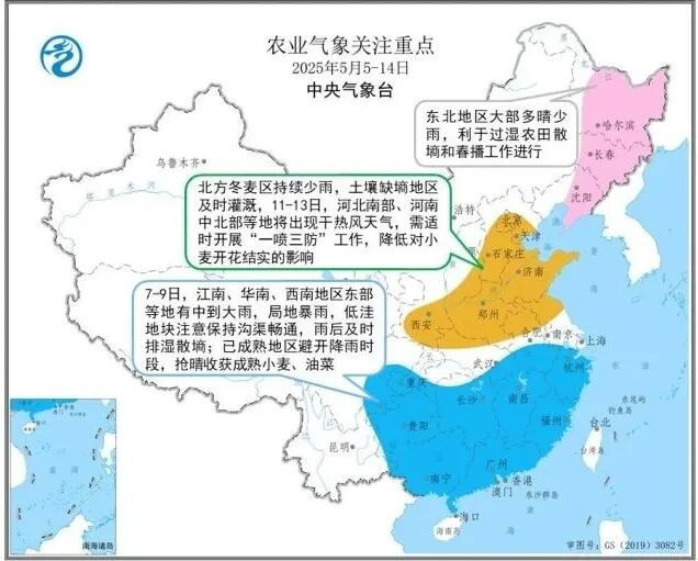 未来天气对农业生产影响↓↓↓预计未来10天,东北地区大部多晴少雨,利于过湿农田散墒和春播工作进行;华北、黄淮、江淮等地降水持续偏少,部分地区旱情将持续或发展,11至13日,河北南部、河南中北部等地将出现干热风天气,可能导致小麦灌浆受阻、千粒重下降,并易加剧蚜虫增殖和扩散为害;江南南部、华南北部一带降水显著偏多,7至9日,江南、华南、西南地区东部等地有中到大雨,江南南部、华南北部部分地区有暴雨,局地有大暴雨,并伴有短时强降水、雷暴大风等强对流天气,易导致油菜倒伏、低洼农田渍涝等,13日后,西南地区东部、江南、华南北部等地还将有一次降雨过程,田间适温高湿环境会加速病虫害发生发展。