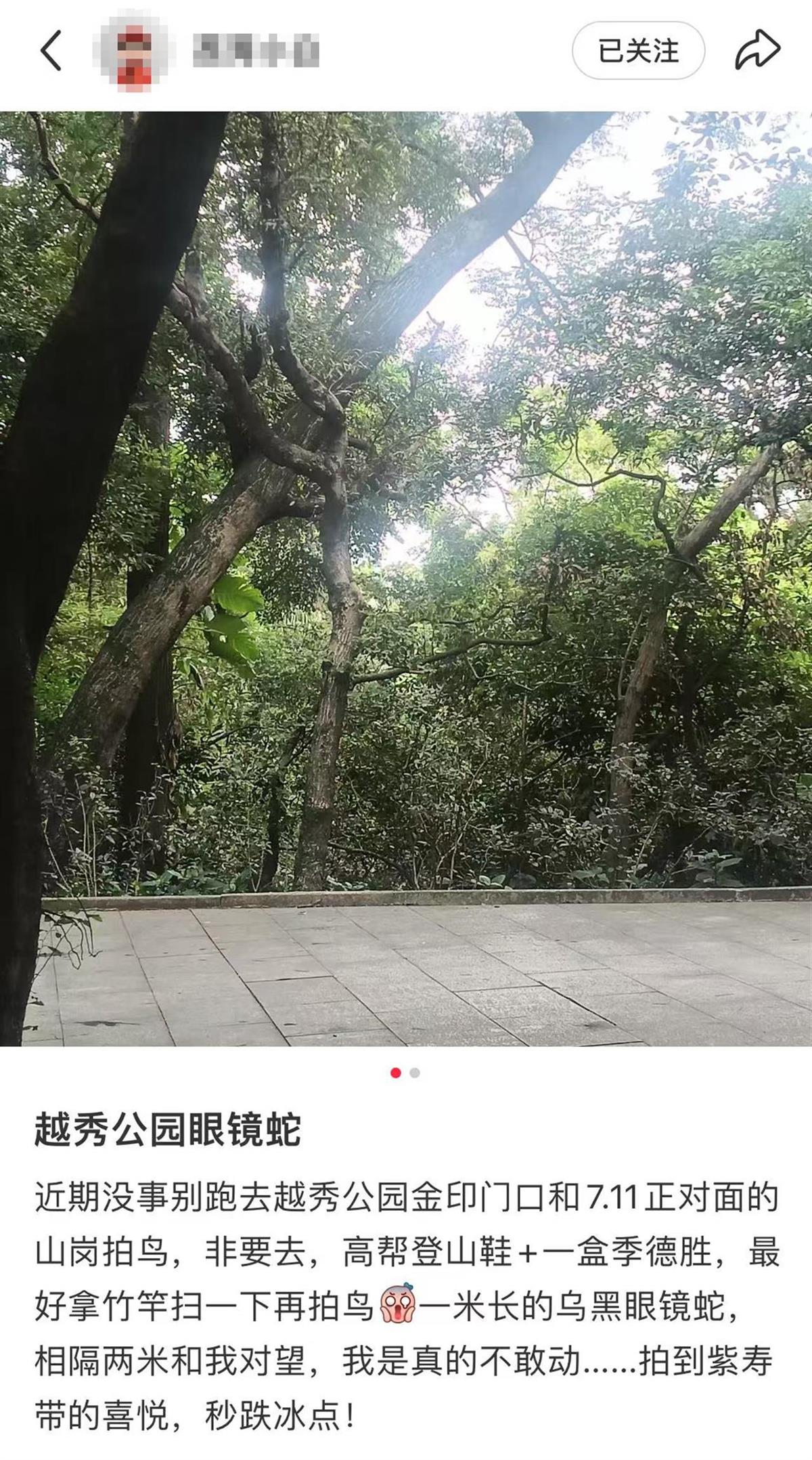 该网友发文称,其在越秀公园的一个山岗拍鸟时遇见一条一米多长的乌黑眼镜蛇,与蛇相隔两米对望,吓得不敢动。