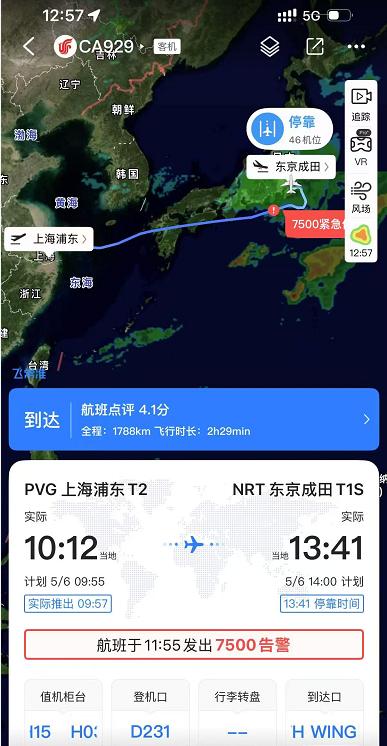 5月6日,网上一张“飞常准”官网截图显示,上午10:12从上海浦东机场T2飞往日本东京成田机场的CA929航班,在11:55发出“7500”告警信息。截图显示,整个航程1788公里,飞行时长2小时29分。