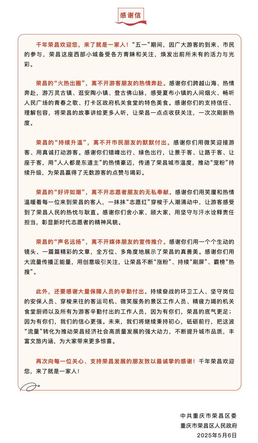 5月6日,荣昌区委区政府发出“感谢信”,信中写道:“‘五一’期间,因广大游客的到来、市民的参与,荣昌这座西部小城备受各方青睐和关注,焕发出前所未有的活力与光彩。”“荣昌的‘火热出圈’,离不开游客朋友的热情奔赴。感谢你们跨越山海、热情奔赴,游万灵古镇、逛安陶小镇、登古佛山脉,感受夏布小镇的人间烟火、畅听人民广场的青春之歌、打卡区政府机关食堂的特色美食。感谢你们的支持信任、理解包容,将荣昌的故事讲给更多人听,让荣昌一点点收获关注,一次次刷新热度。”