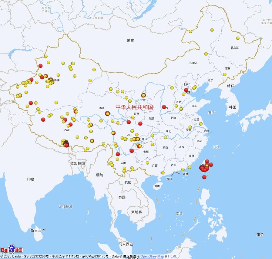 2025年以来(截至4月30日)全国三级地震活动分布图(四级以上红色标注)