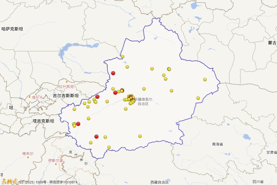 2025年以来(截至4月30日)新疆三级地震活动分布图(四级以上红色标注)