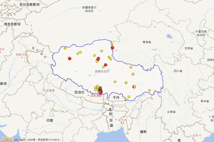 今年以来(截至4月30日),西藏共发生三级以上地震125次,其中3.0到3.9级104次,4.0到4.9级19次,5.0到5.9级1次,6.0级到6.9级1次,最大地震是1月7日在西藏日喀则市定日县发生的6.8级地震。4月,西藏共发生三级以上地震16次。