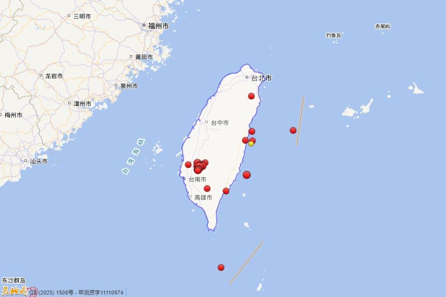 2025年以来(截至4月30日)台湾四级地震活动分布图(四级以上红色标注)