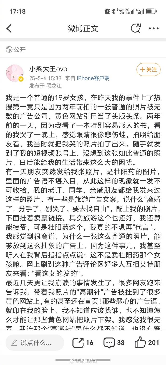 5月6日,此前因被“高潮针”等不良广告盗图而深受困扰的19岁女子梁女士发布微博,她呼吁短视频平台能够完善举报制度。此前她发现照片被广告盗用后,立即在平台举报这些广告视频,但被平台告知需要提交种类繁多的证明材料,结果最后举报并未成功。梁女士说,她不理解为什么这种包含非法信息的低俗广告,在短视频平台上能够获得这么大的流量。她同时希望大家对待受害者能善良一些,不要宣扬“受害者有罪论”。
