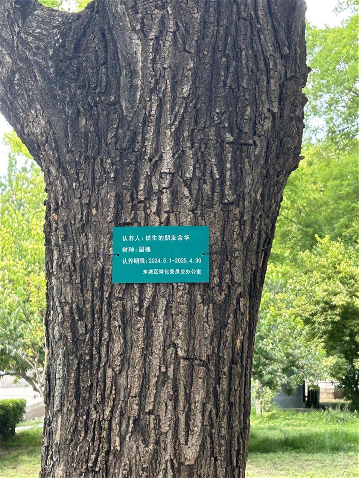 五一期间,有网友晒出,在北京地坛公园看到两棵被人认养的槐树,一棵树的认养人是“铁生的朋友余华”,另一棵树的认养人是“余华的朋友铁生”。两棵树的认养期限均为2024年5月1日至2025年4月30日。因认养期限已到,不少网友喊话余华前来续费。