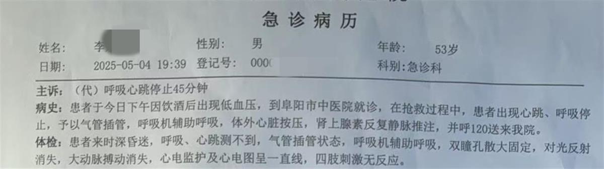 4日19时20分左右,李先生的父亲被转至阜阳市另外一家医院抢救。这家医院急诊病历显示,“患者于今日下午因饮酒后出现低血压。到阜阳市中医院就诊,在抢救过程中,患者出现心跳、呼吸停止,予以气管插管,呼吸机辅助呼吸,体外心脏按压,肾上腺素反复静脉推注,并呼120来我院。”