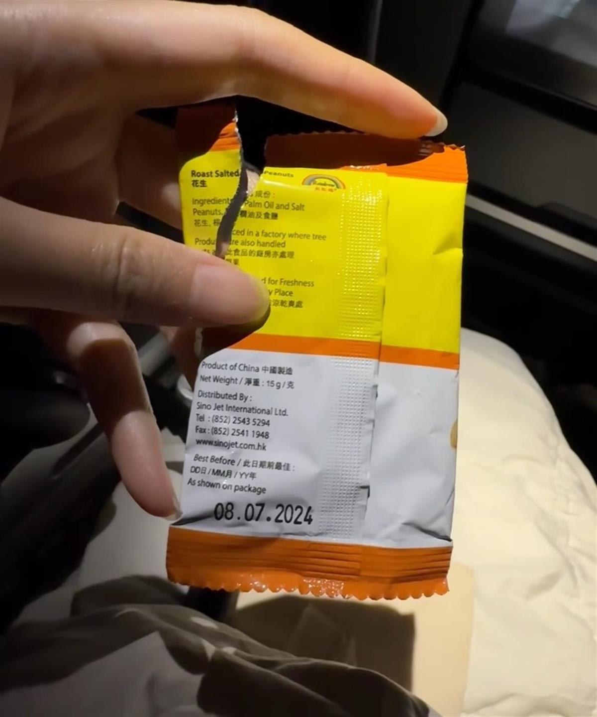 该网友称,5月5日她一家人乘国泰航空的航班从奥克兰飞回香港,途中,她找空姐要小零食给小朋友吃,空姐给了她一包杏仁和一包花生。因杏仁是烟熏的,她想着味道太重,就将那包花生递给了孩子。她给孩子吃的时候并没有检查,孩子吃了半包就递给她。她接着吃,吃完随手翻过来,看到包装上显示最佳食用期为2024年7月8日前,觉得不可思议。“我把包装袋交给空姐,我说这个过期了,她说她确认一下,就没有下文了,连道歉都没有!”该乘客在帖文中表示愤慨,她透露,当时空姐还给机上其他乘客分发了一些,她的老公也拿到一包,但没有吃。