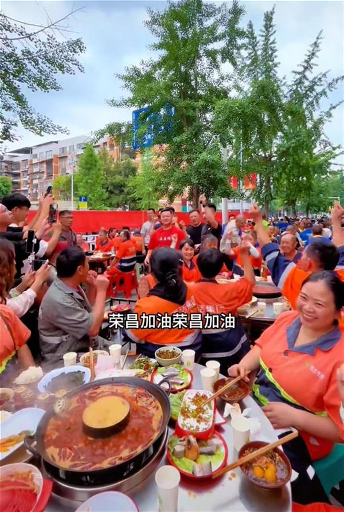 前述高洁公司工作人员告诉极目新闻记者,他们负责荣昌城区所有道路的环卫工作,该公司有负责园林绿化和清扫保洁的环卫工作人员,“我们公司有1200名环卫工人,分两批,今天有600名环卫工人去吃火锅,明天再去一批。”