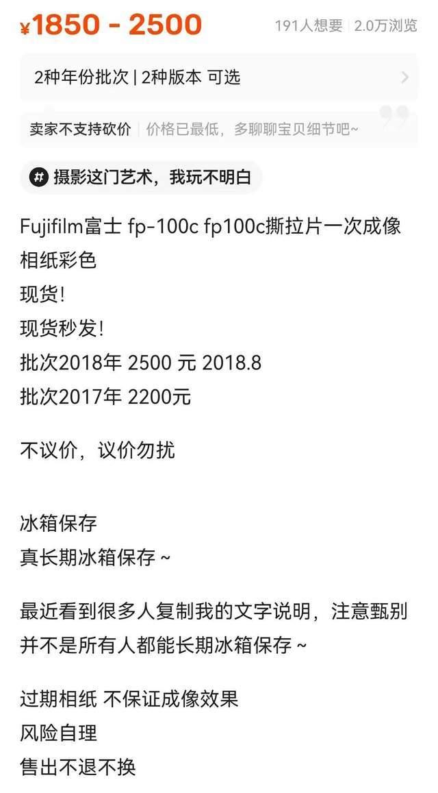 其价格暴增与社交平台上忽然掀起的复古拍摄风有关,2024年FP-100C单张价格就破百元了,一盒要一千元上下,到了2025年以小红书为主的年轻人社交平台出现了“体验拍一张就少一张撕拉片”的趋势,撕拉片在二手交易平台的价格飙升,有卖家挂出了两千多元一盒的价格现货出售,且不接受买家讲价,相当于每张撕拉片价格200元左右,到了照相馆单张价格要比胶片卖家的更贵了,上海某照相馆于今年1月底发布了撕拉片价格调价公告,一张撕拉片定价359元,撕拉片是一次性耗材,属实是一次拍摄几秒体验几百块钱瞬间消失。
