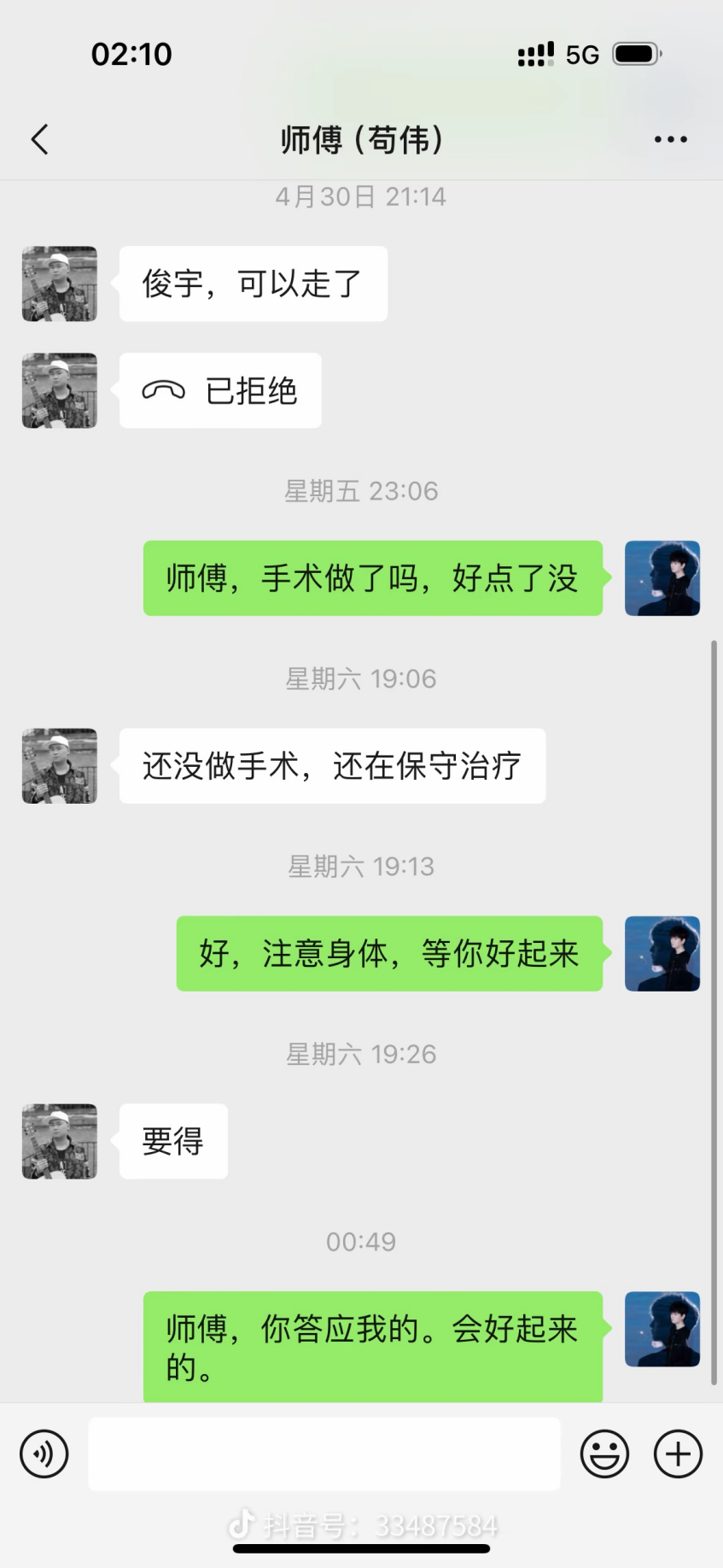 5月7日上午,苟伟的圈内好友林俊宇在社交平台发出的聊天记录显示,5月3日,他还问候了苟伟病情,苟伟回复称:“还没做手术,还在保守治疗。”