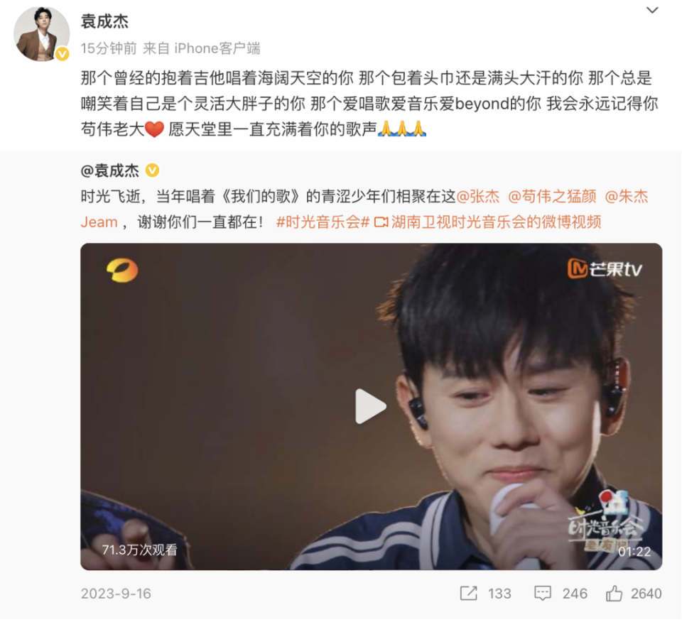 5月7日,好友袁成杰发文悼念苟伟:“那个曾经的抱着吉他唱着海阔天空的你,那个包着头巾还是满头大汗的你,那个总是嘲笑着自己是个灵活大胖子的你,那个爱唱歌爱音乐爱beyond的你,我会永远记得你,苟伟老大,愿天堂里一直充满着你的歌声。”