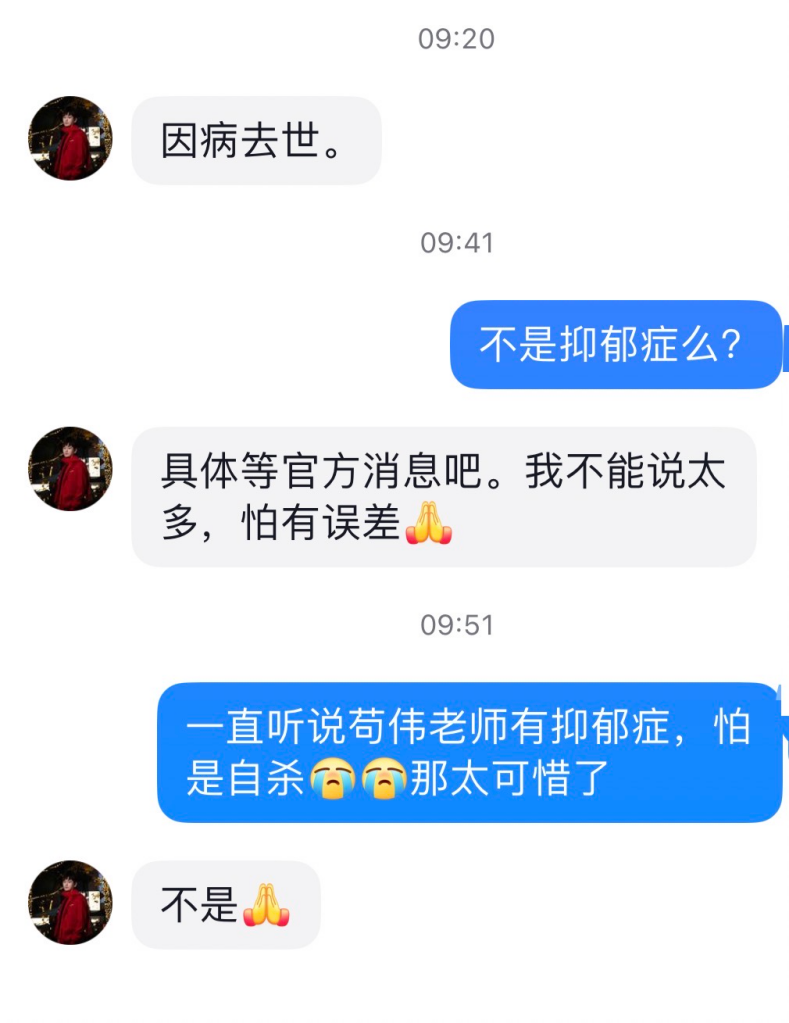 经视直播记者私信林俊宇,他表示,苟伟是因病去世,并非网传抑郁症自杀,具体情况等官方消息。