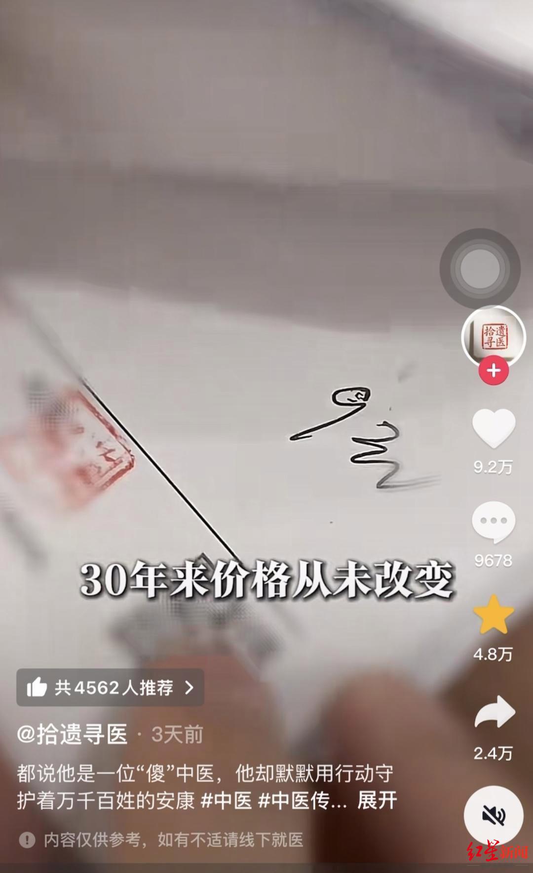 4月底,上述视频发布在抖音平台一个名为“拾遗寻医”的账号上。视频中除了提及李某某医生开具的“一张处方只要几块钱”外,还提到他创造了许多“奇迹”:一个80多岁的老奶奶在得病后,家人以为没治了,“棺材都准备好了”,但找到他后,经过中药调理,“据说现在还在”。