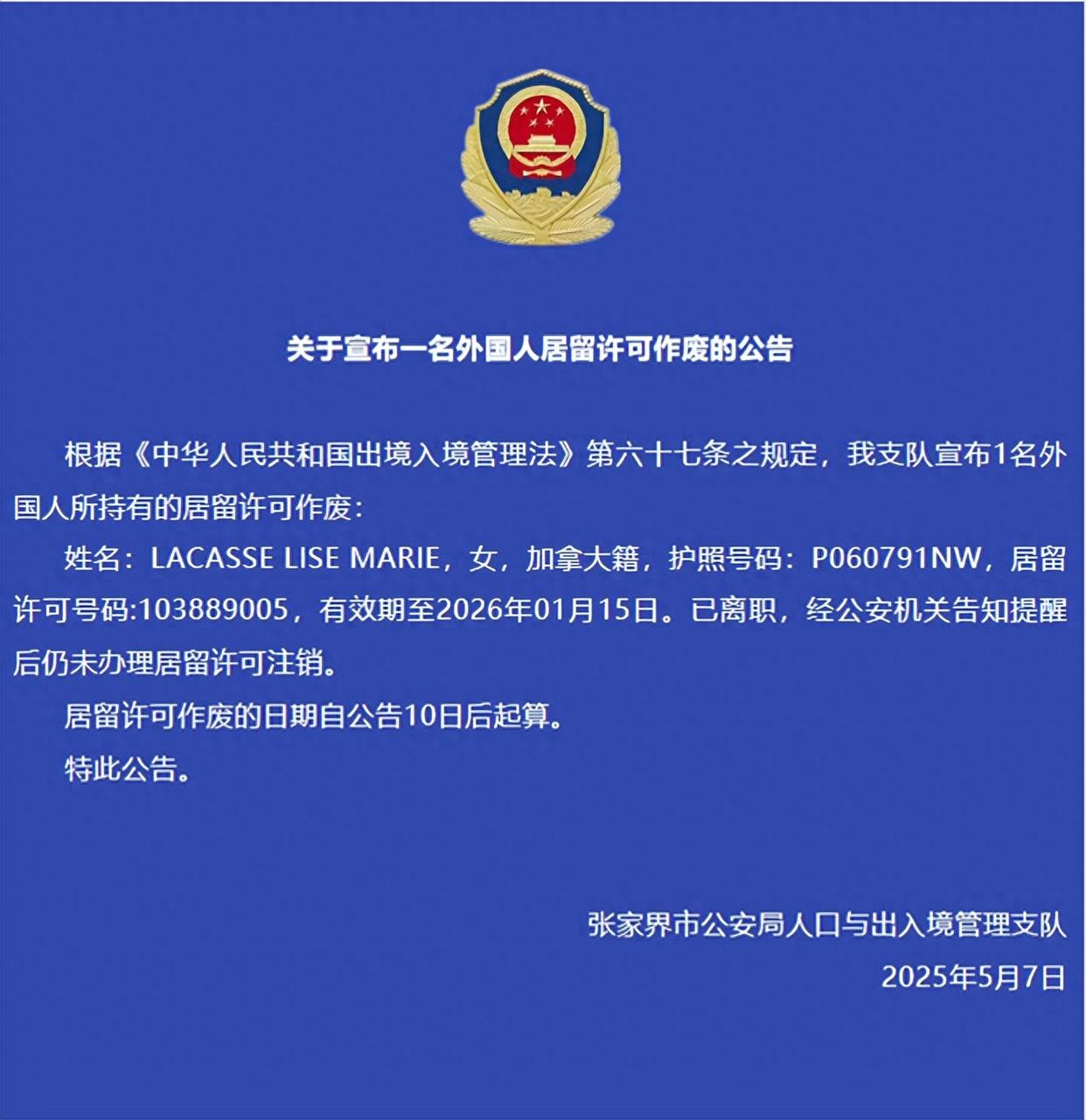 姓名:LACASSE LISE MARIE,女,加拿大籍,护照号码:P060791NW,居留许可号码:103889005,有效期至2026年01月15日。已离职,经公安机关告知提醒后仍未办理居留许可注销。