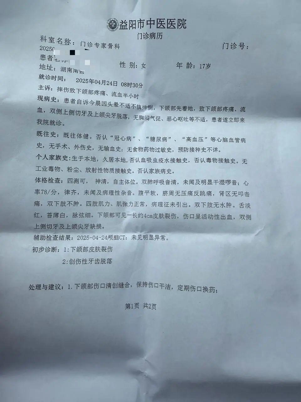 龚女士介绍,自己17岁的侄女在湖南医药职业中等专业学校读高二,今年2月,被学校安排至益阳市中医医院实习。4月24日8时许,在医院突然晕倒,面部朝下摔倒,导致4颗牙齿碎裂,下颌有4厘米长伤口。