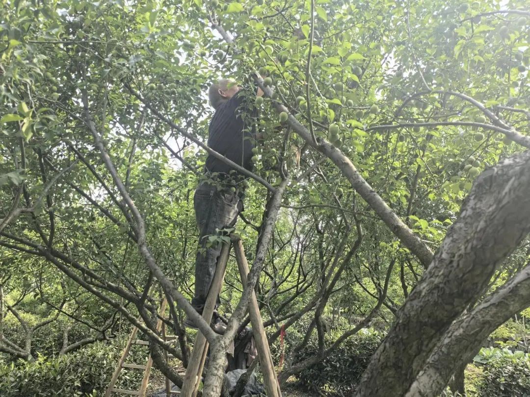 每棵树高五六米,郭大伯需要爬到树干上,再用特制的工具,将树梢上一颗颗成熟的梅子摘下来。
