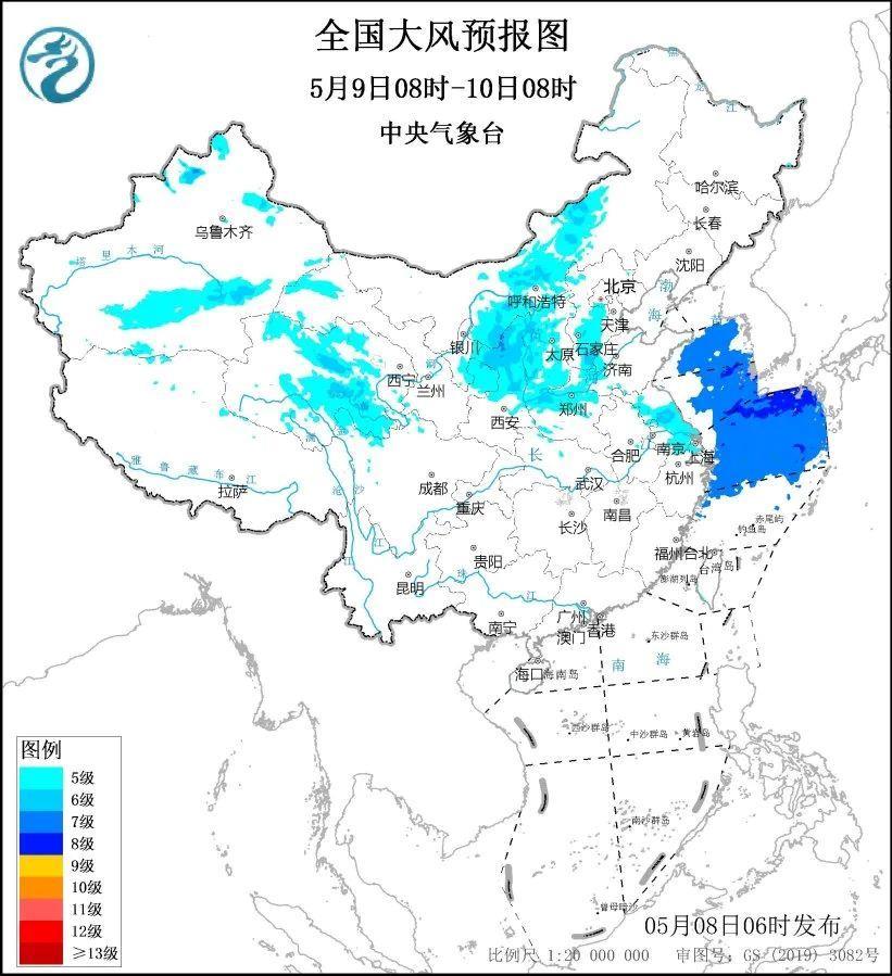 5月9日8时至10日8时,新疆南疆盆地、内蒙古中东部、青海中东部、西北地区东部、华北西部、黄淮西部、江苏、浙江等地部分地区有5至6级、阵风7至8级,其中,内蒙古中部、陕西北部等地的部分地区平均风力可达7级、阵风8至10级;黄海中部和南部海域、东海北部海域将有7至8级、阵风9级的大风,其中东海东北部部分海域将有9级、阵风10级大风。