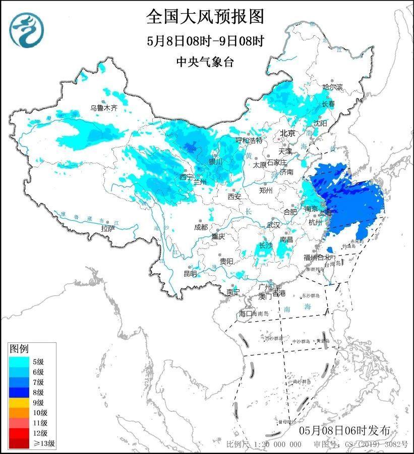 预计,5月8日8时至9日8时,新疆南疆盆地、内蒙古、青海、甘肃东部、宁夏、陕西北部、辽宁西部、江苏、浙江等地部分地区有5至6级、阵风7至8级,其中,内蒙古西部等地的部分地区平均风力可达7级、阵风8至10级;黄海中部和南部海域、东海大部海域将有7至8级、阵风9级的大风,其中东海东北部部分海域将有9级、阵风10级大风。