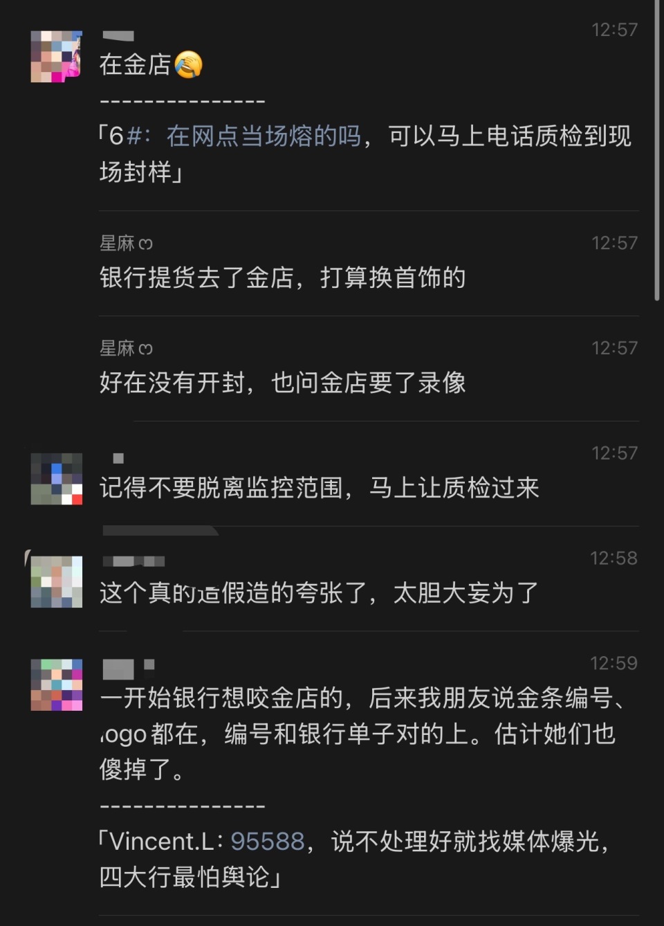 该网友表示,系在银行提货后去金店打算换成首饰,“好在没有开封,也问金店要了录像。”“一开始银行想说是金店的(问题)。后来,我朋友说金条编号、Logo都在,编号和银行单子对的上。”“你们曾经换过的,要不也去熔一下看看。”