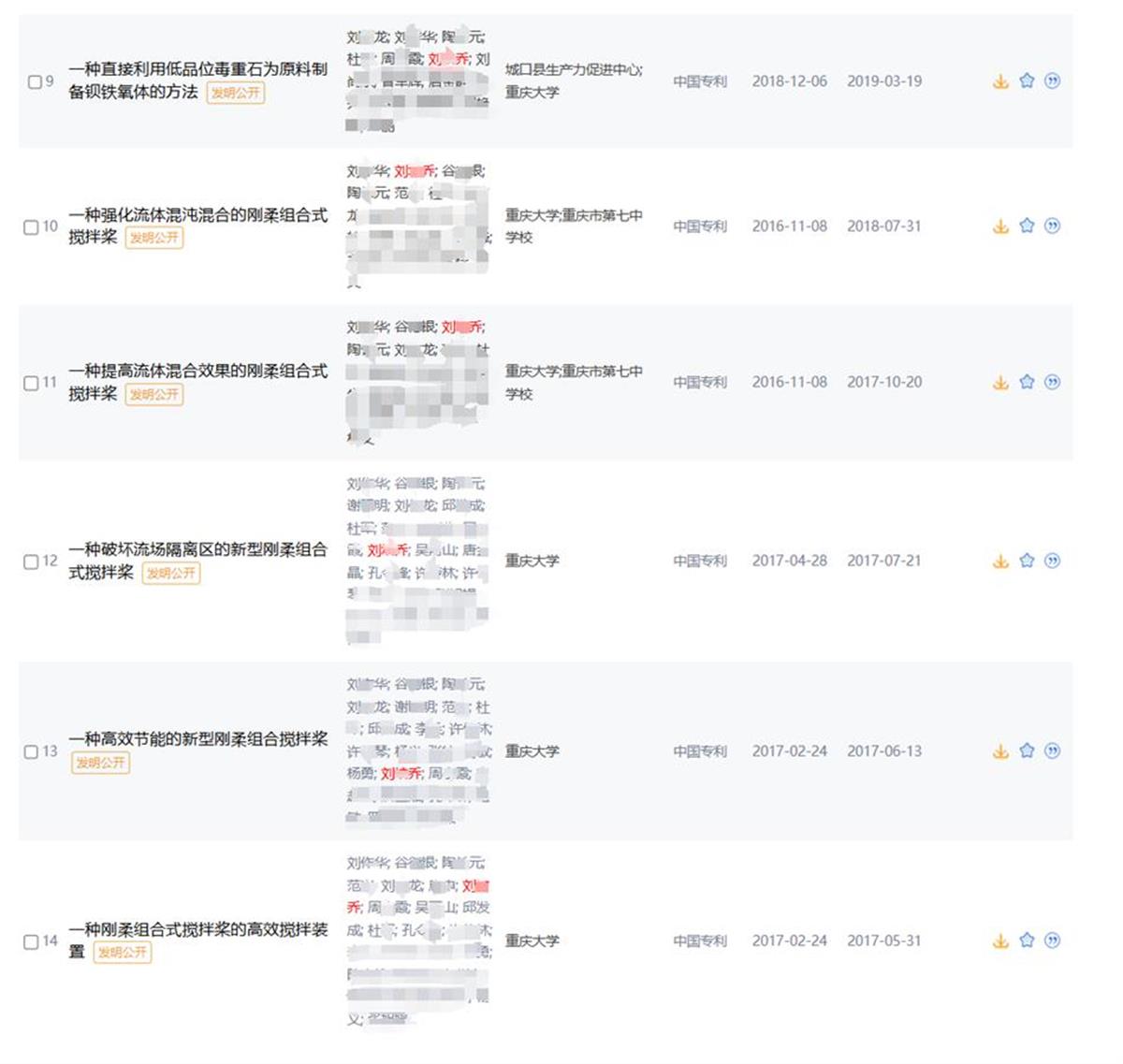 前述推文引发社会关注和讨论。据知网数据显示,自2016年11月8日到2023年6月2日,共计有14项发明专利的发明人中涵盖刘某乔的名字,且申请人均涉及重庆大学。不过这些发明专利中她并非第一作者。有12项的发明专利的第一作者为刘某华,其中两项的第一作者为刘某龙。