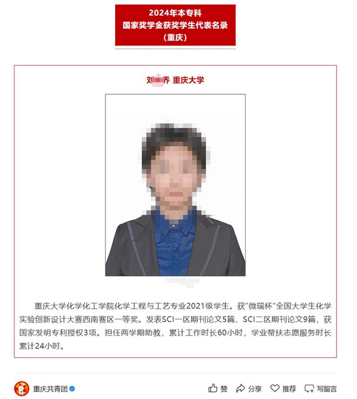近日,一篇关于重庆大学大四学生刘某乔获得国家奖学金的推文引发关注,推文中该学生的介绍称,其发表SCI论文十余篇,获国家发明专利授权3项。