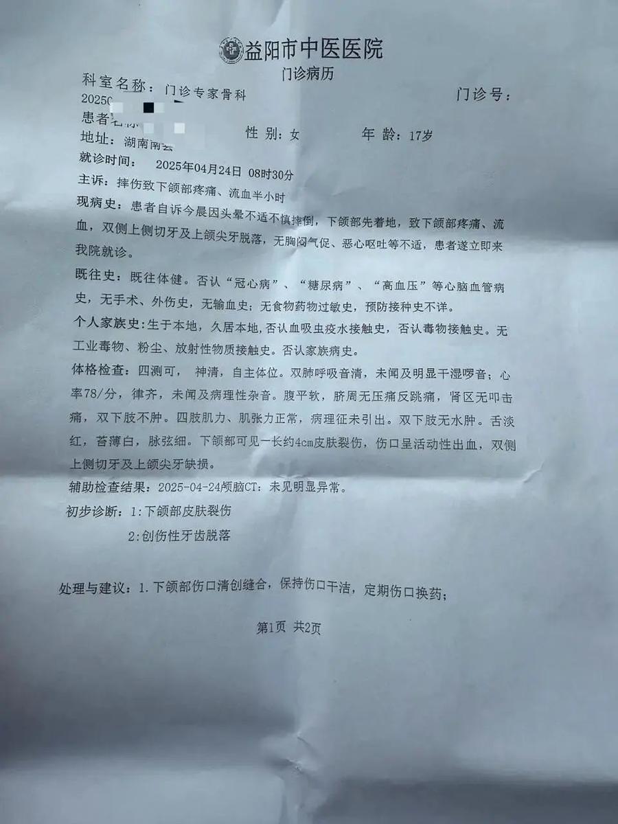 龚女士介绍,侄女在湖南医药职业中等专业学校读高二,今年2月,孩子被学校安排至益阳市中医医院实习,4月发生了晕倒后摔伤的事情,门诊病历显示,初步诊断为下颌部皮肤裂伤、创伤性牙齿脱落。