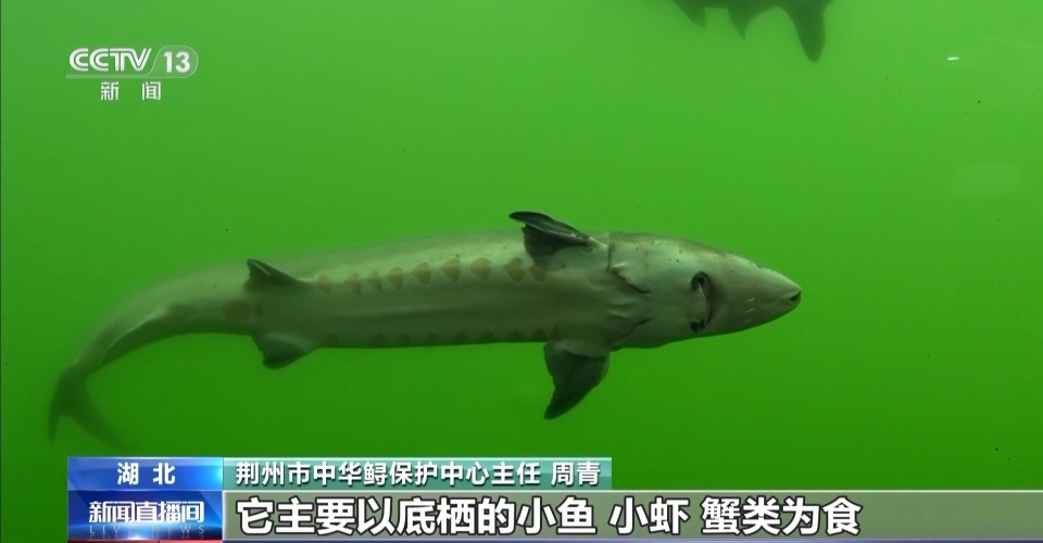 荆州市中华鲟保护中心主任 周青:中华鲟是底栖鱼类,也是江海洄游的鱼类,它们的嘴巴是下位的,主要以底栖的小鱼、小虾、蟹类为食。它们贴着边边游,主要就是为了觅食方便。