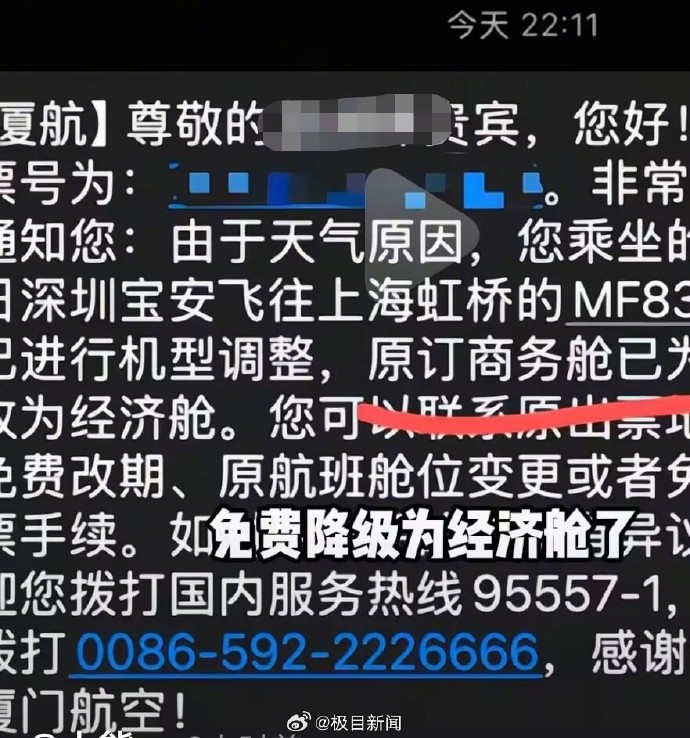 5月7日,有博主发视频称,5月6日,他乘坐厦门航空从深圳宝安飞往上海虹桥的MF8318航班时,遭遇了“免费降舱”的情况,即从商务舱降到经济舱。他选择取消值机,并改签到次日飞机的商务舱,在机场的安排下入住了酒店。