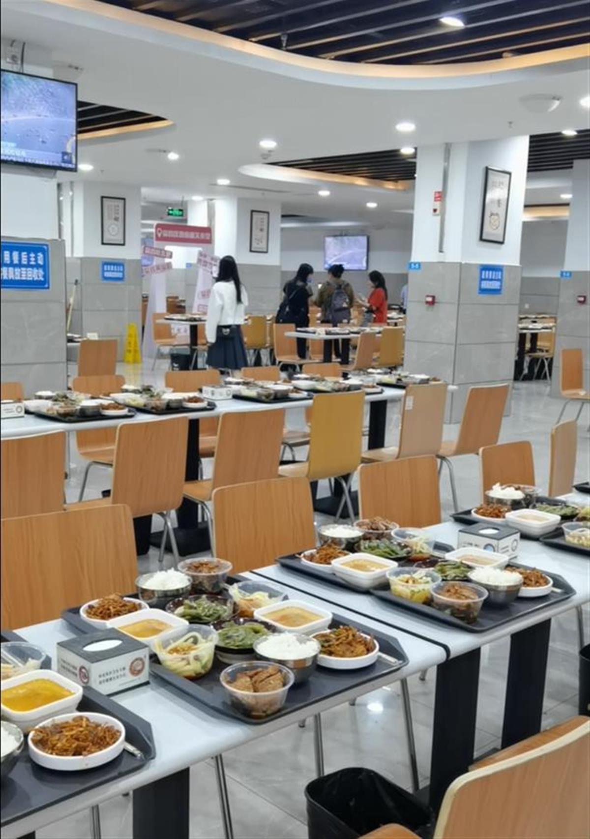 荣昌区机关事务中心副主任兰洪梅告诉极目新闻记者,当天有1015名环卫和园林工人到区政府食堂用餐,食堂准备了小碗菜套餐,两荤两素一汤,菜品包括卤鹅、回锅肉、番茄肉片汤等,“全部提前摆到桌子上去了的,不用他们取菜,很有仪式感,进来就能找到座位吃饭。”