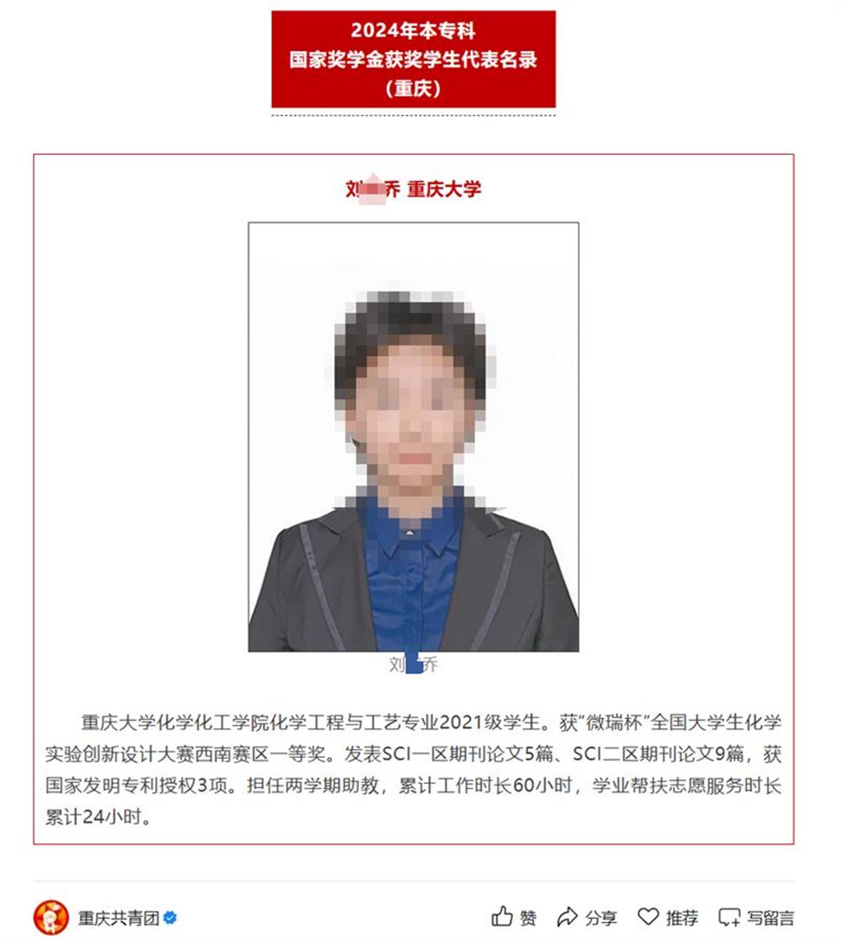 据极目新闻此前报道,近日,一篇关于重庆大学大四学生刘某乔获得国家奖学金的推文引发关注,推文中该学生的介绍称,其发表SCI论文十余篇,获国家发明专利授权3项。