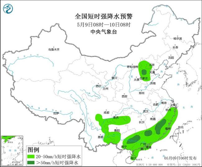 预计5月9日08时至10日08时,黄淮中部、江南东部、华南等地的部分地区将有8级以上雷暴大风或冰雹天气,其中,广西东部等地的部分地区将有10级以上雷暴大风,最大风力可达11级以上;华北中部、江南东部、西南地区东部、华南等地的部分地区将有小时雨量大于20毫米的短时强降水天气,其中,河北西南部、江西南部、福建西部、广西东部、广东北部等地的部分地区小时雨量大于50毫米,最大可达80毫米以上。