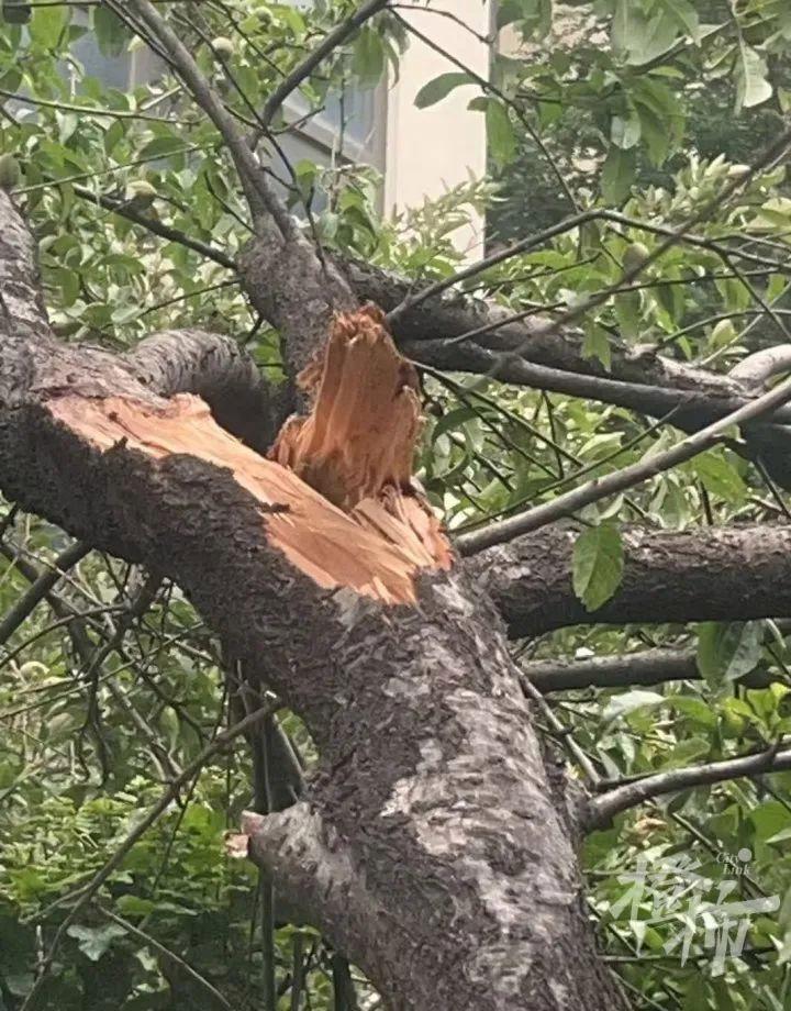 万女士跑到楼下发现,玻璃窗直接把一棵桃树砸断了。“幸亏楼下当时没人经过,不然后果很可怕。”
